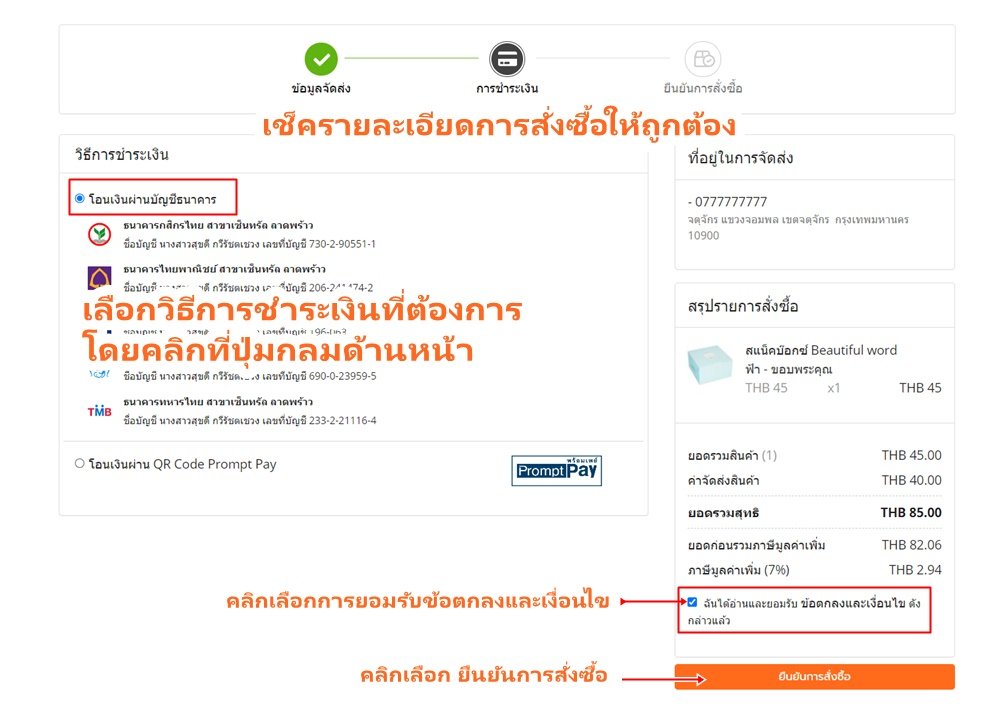 ที่ช่องสรุปรายการสั่งซื้อ ลูกค้าเช็ครายละเอียดให้ถูกต้อง หากเรียบร้อยแล้ว กดเลือก 'ยืนยันการสั่งซื้อ' ได้เลยค่ะ