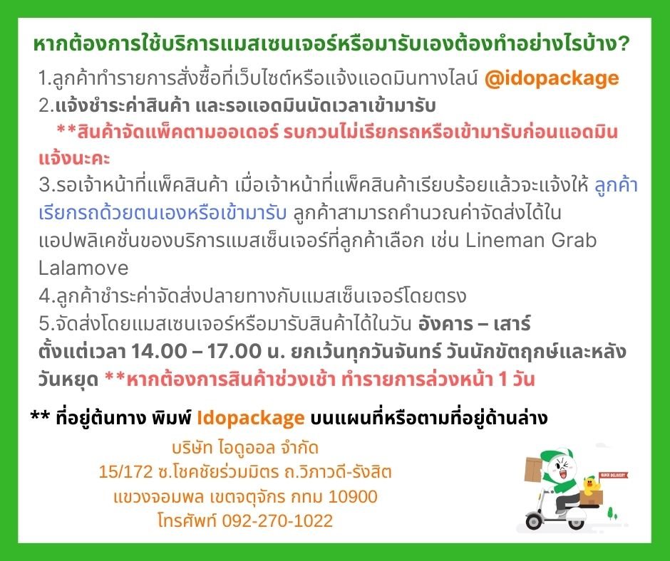 **จัดส่งโดยไลน์แมนได้ทุกวันทำการ อังคาร – เสาร์ 14.00 – 17.00 น. ยกเว้นวันหยุดราชการ/ วันจันทร์และหลังวันหยุดราชการ เนื่องจากจะมีปริมาณออเดอร์ค้างจากช่วงวันหยุดค่อนข้างมาก